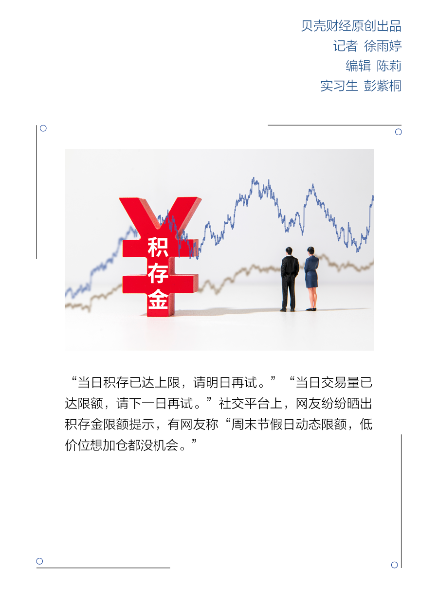 “當日積存已達上限,限購請明日再試。銀行”“當日交易量已達限額,積存金節假日繼續請下一日再試。清早搶空搶籌”社交平臺上,惕風網友紛紛曬出積存金限額提示,限購有網友稱“周末節假日動態限額,銀行低價位想加倉都沒機會。積存金節假日繼續”